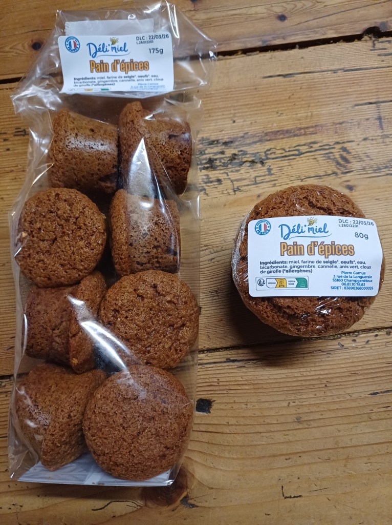 Ingrédients : miel, farine de seigle*, œuf*, eau, bicarbonate, gingembre, cannelle, anis vert, clous de girofle (*allergènes). Et orange pour les pains d’épices à l’orange.